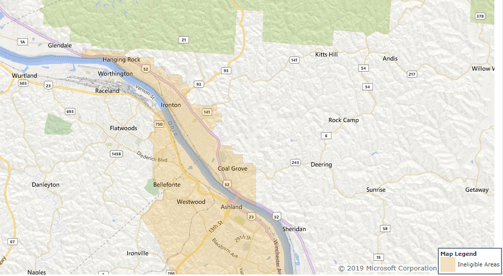 The only area of Lawrence County, Ohio that is not eligible for the USDA Rural Development Loan program is the area along Route 52 running around Ironton that runs along the Ohio River from Hanging Rock to Coal Grove. This is the only area of Lawrence County, Ohio that is not eligible for the USDA Rural Development Loan program. Outside of this area, the rest of Lawrence County, Ohio is geographically eligible for the No Down Payment USDA Mortgage Program.